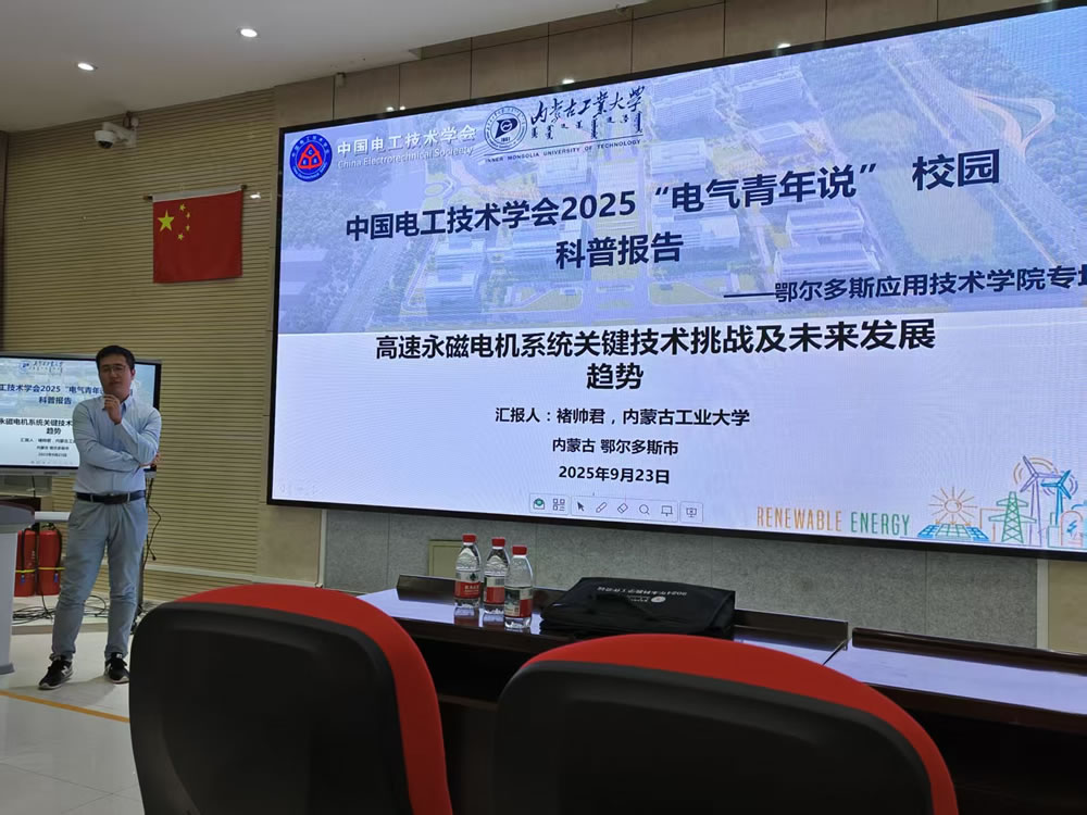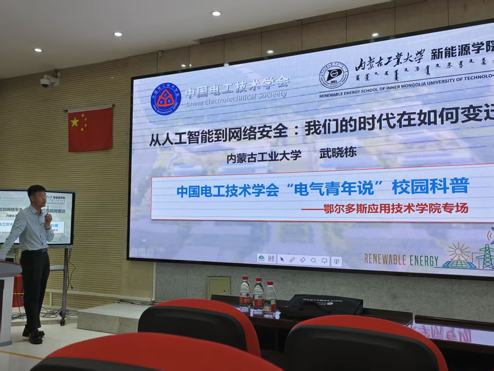 2025年9月23日,由中国电工技术学会与科普中国主办、鄂尔多斯应用技术学院与内蒙古工业大学新能源学院共同承办的“电气青年说”校园科普报告会,在鄂尔多斯应用技术学院康巴什校区博学楼102顺利举行。本次活动吸引了200余位师生参与,现场气氛热烈。报告会邀请了鄂尔多斯应用技术学院王伟副教授、王继强副教授,以及内蒙古工业大学武晓栋老师、褚帅君老师分别进行了专题分享与交流。