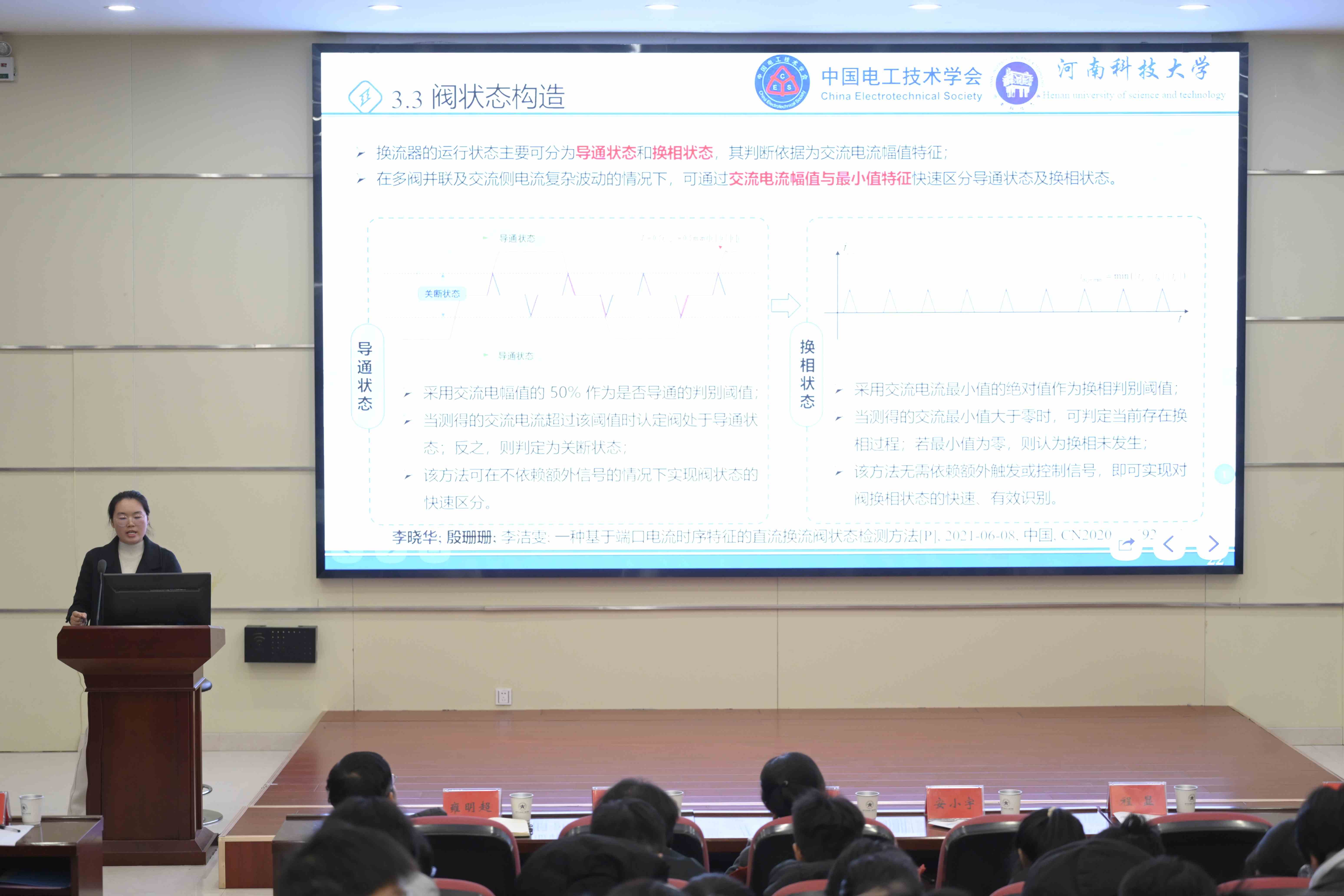 河南科技大学殷珊珊讲师以“从概念到前沿——走进新型电力系统”为题,逐层解析。她先阐释了新型电力系统“高比例新能源消纳”的核心概念;再结合“西电东送”实例,说明高压直流输电的支撑作用;重点讲解换流器透明化技术破解“黑箱运维”及故障定位方法提升电网可靠性的价值;最后展望技术融合对系统安全的保障作用,鼓励学子创新。