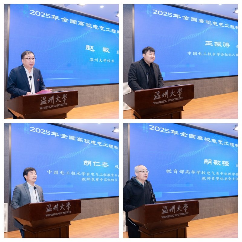 2025年全国高校电气工程教育学术年会暨第四届全国高校电气类专业青年教师实践教学设计创新大赛决赛于2025年12月16至21日在浙江温州圆满落幕。教育部高等学校电气类专业教学指导委员会主任胡敏强教授、温州大学校长赵敏教授、浙江大学陆国栋教授、哈尔滨理工大学戈宝军教授、东南大学胡仁杰教授、中国电工技术学会组织人事部王振涛主任、亚龙智能装备集团股份有限公司陈继权董事长等领导出席会议,来自清华大学等全国222所高校的专家学者、青年教师及学生代表450余人齐聚温州大学,共同探索电气工程教育创新和人才培养质量提升路径。大会开幕式由温州大学电气与电子工程学院副院长舒亮教授主持。
