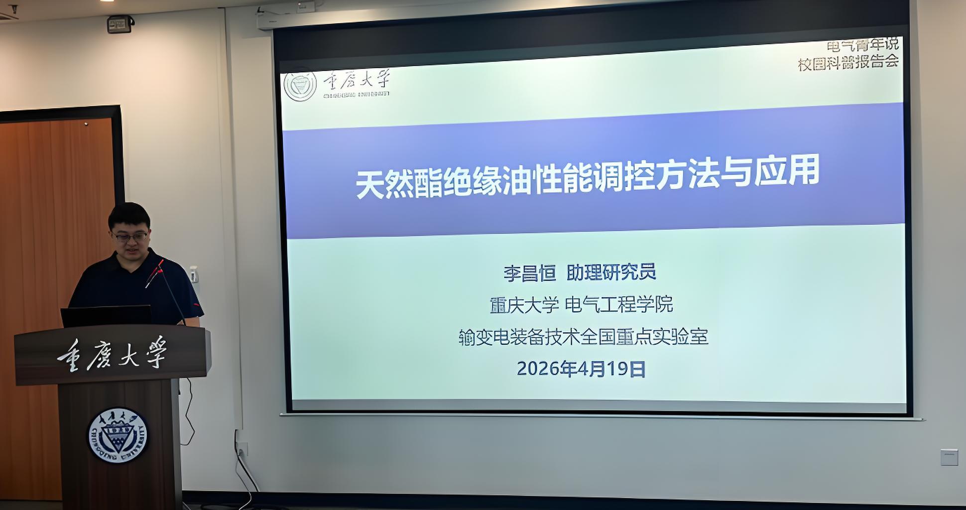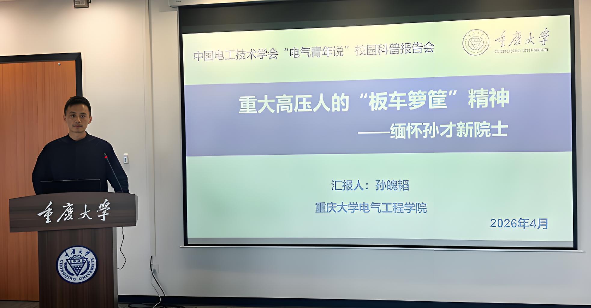 2026年4月19日,由中国电工技术学会与科普中国主办、重庆大学与输变电装备技术全国重点实验室承办的“电气青年说”校园科普报告会,在重庆大学(虎溪科学城校区)工科大楼GC704成功举办。本次活动由重庆大学黄正勇研究员担任召集人,邀请了重庆大学电气工程学院教授孙魄韬、国网四川经研院高级工程师许文杰、重庆大学电气工程学院助理研究员李昌恒和四川大学电气工程学院助理研究员唐昕宇作专题报告与现场交流。